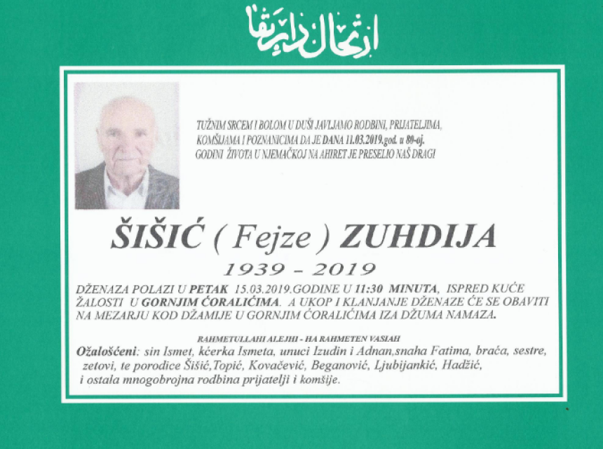 Tužnim srcem javljamo rodbini, prijateljima i komšijama da je naš dragi Šišić (Fejze) Zuhdija dana 11.03.2019. godine u 80-oj godini života preselio na Ahiret.