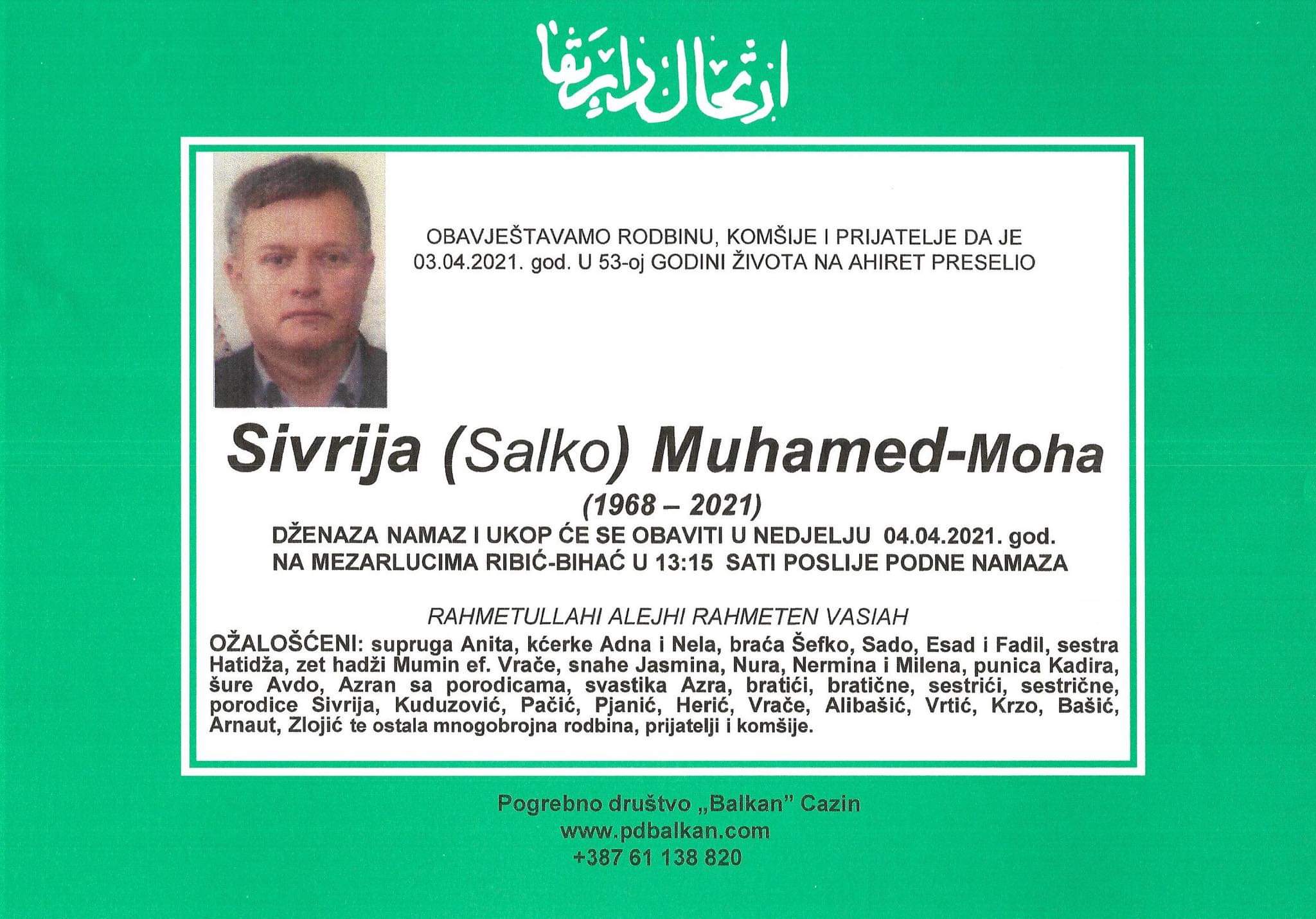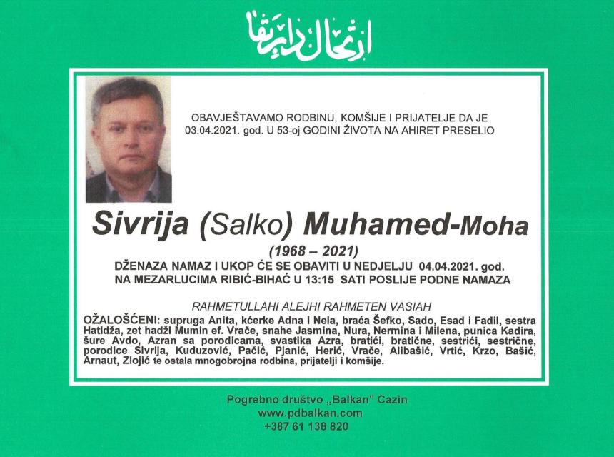Tužnog srca i s bolom u duši obavještavamo rodbinu, komšije i prijatelje da je naš dragi Sivrija (Salko) Muhamed-Moha 03.04.2021. godine, u 53. godini života preselio na Ahiret.