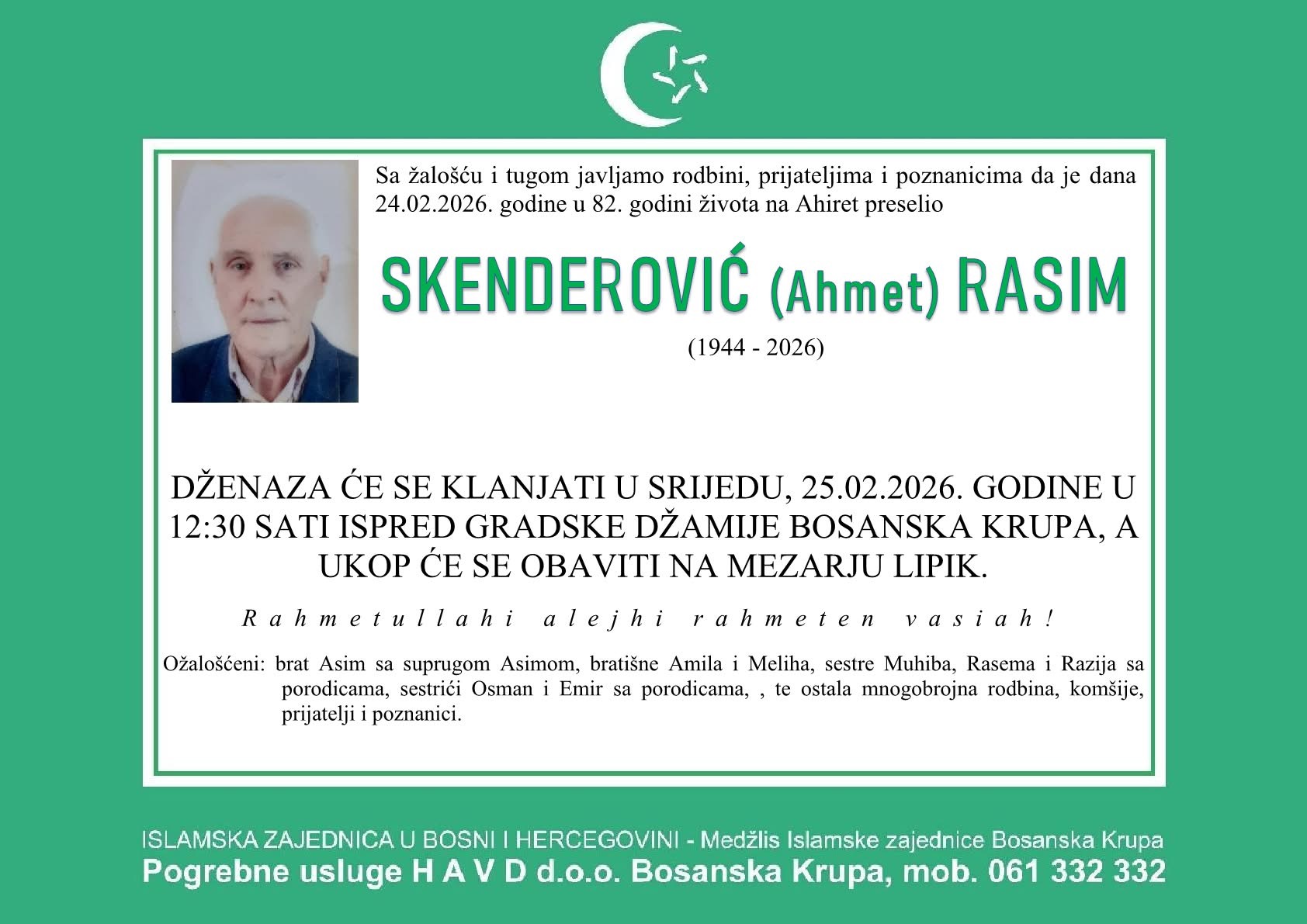 Dženaza će se klanjati u srijedu, 25.02.2026. godine u 12:30 sati ispred Gradske džamije Bosanska Krupa, a ukop će se obaviti na mezarju Lipik.