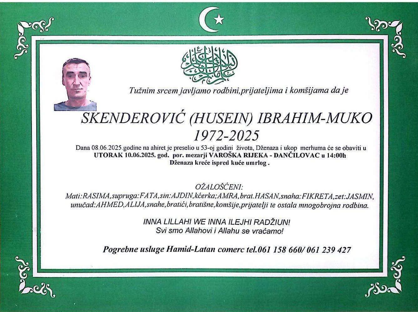 Tužnim srcem javljamo rodbini, prijateljima i komšijama da je dana 08.06.2025. godine u 53. godini života, na ahiret preselio Skenderović (Husein) Ibrahim - Muko