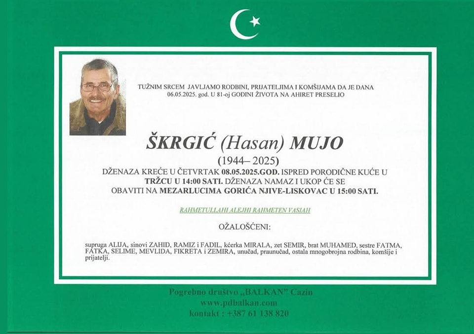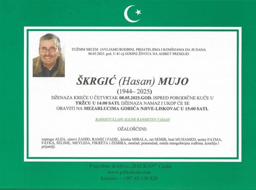 Tužnim srcem javljamo rodbini, prijateljima i znancima žalosnu vijest da je naš dragi Škrgić (Hasan) Mujo dana 06.05.2025. nakon kraće bolesti u 81. godini života preselio na ahiret.