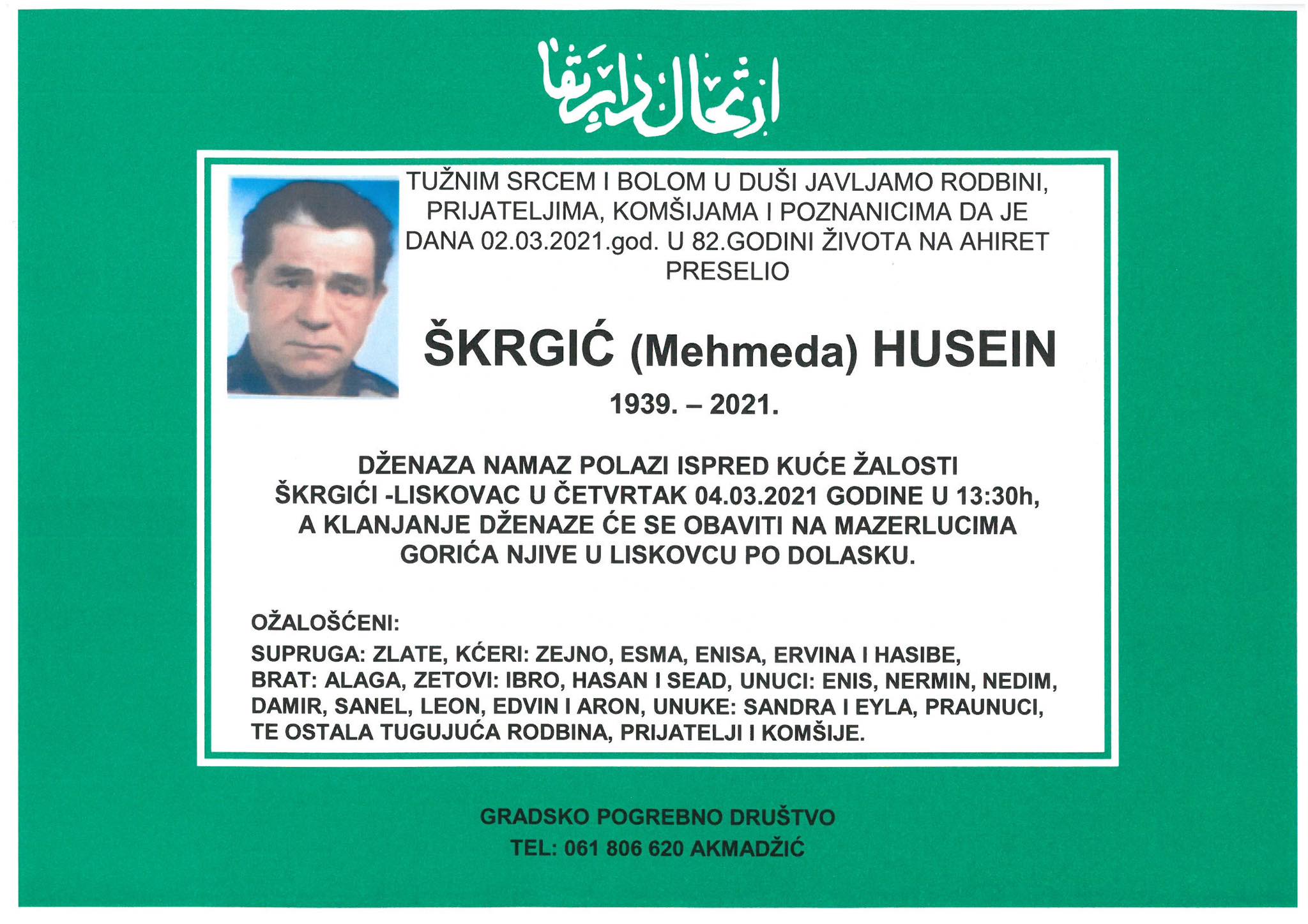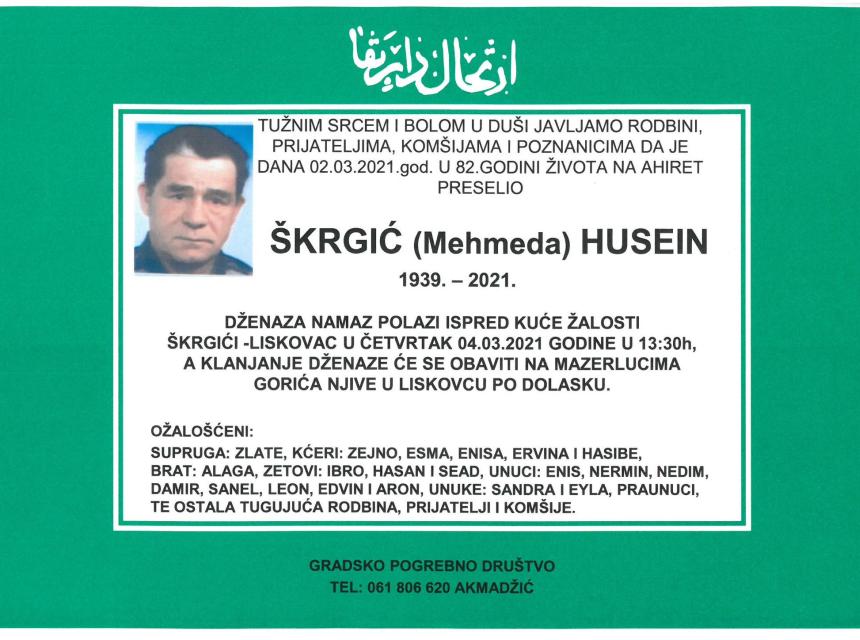Tužnog srca i s bolom u duši obavještavamo rodbinu, komšije i prijatelje da je naš dragi Škrgić (Mehmeda) Husein, dana 02.03.2021 godine, u 82-oj godini života, preselio na Ahiret.