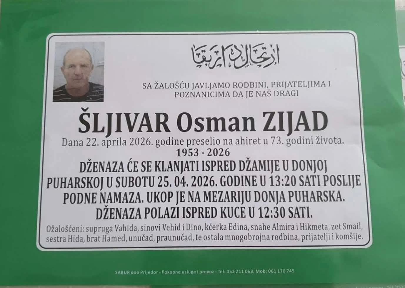 Dženaza će se klanjati ispred džamije u Donjoj Puharskoj u subotu, 25. 04. 2026. godine u 13:20 sati, poslije podne-namaza. Ukop je na mezarju Donja Puharska.