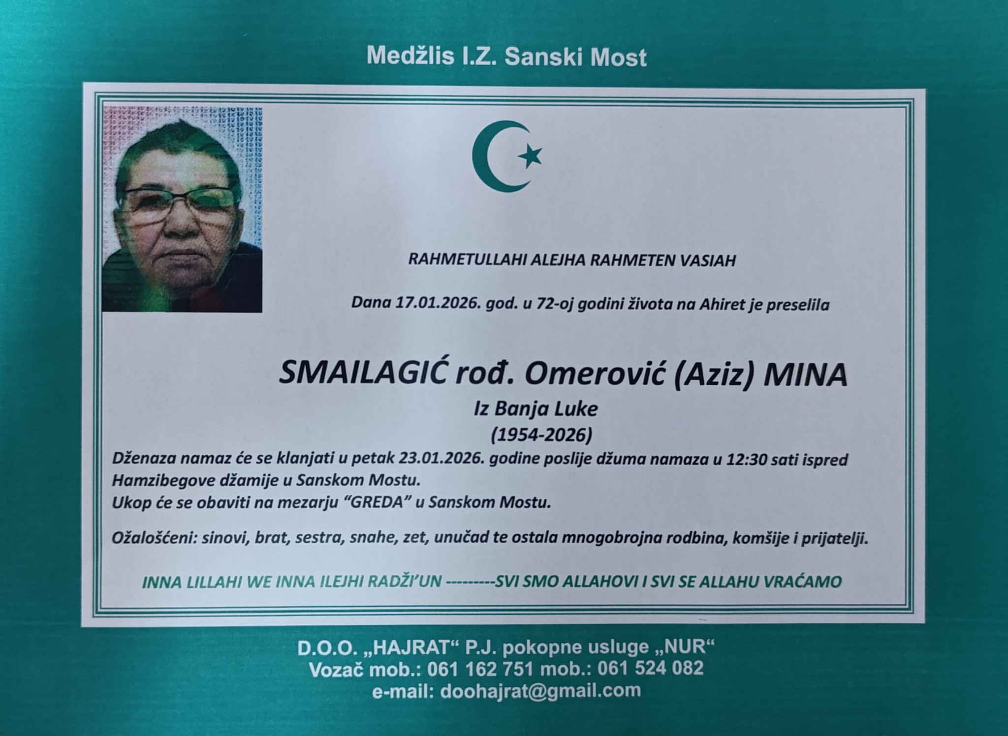 Dženaza namaz će se klanjati u petak 23.01.2026. godine poslije džuma namaza u 12:30 sati ispred Hamzibegove džamije u Sanskom Mostu.