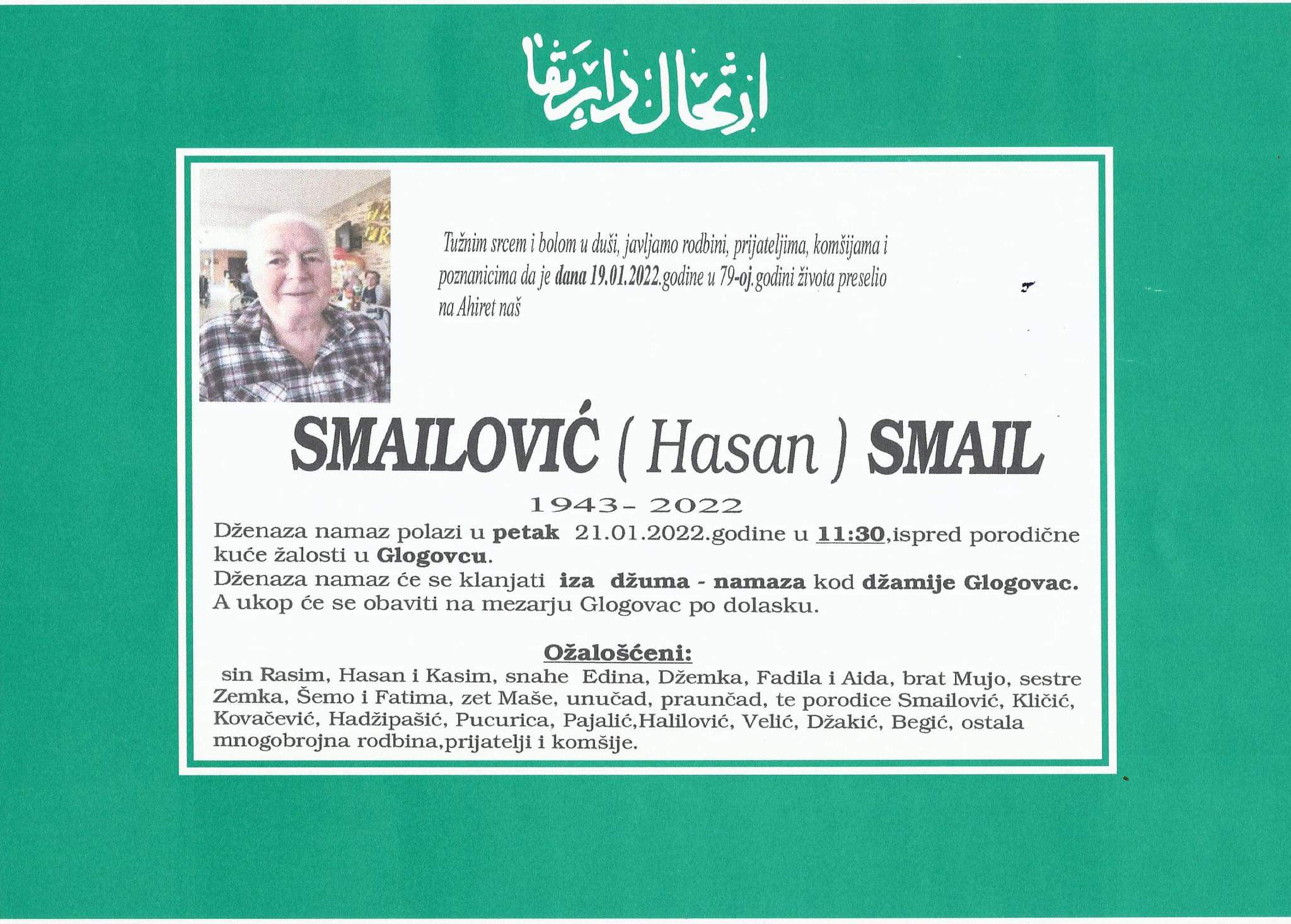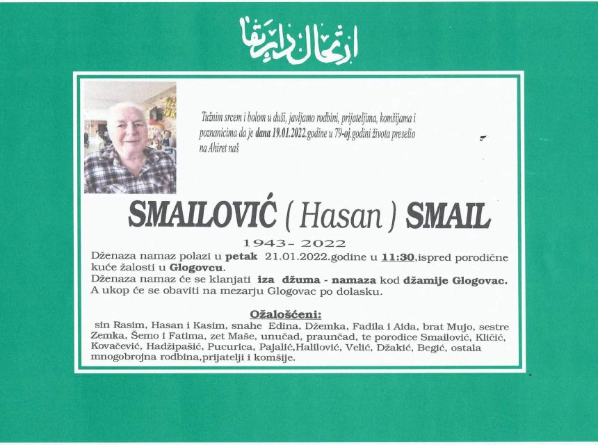 Tužnog srca i s bolom u duši obavještavamo rodbinu, komšije i prijatelje da je naš dragi Smailović (Hasan) Smail 19.1.2022. u 79. godini života preselio na ahiret.