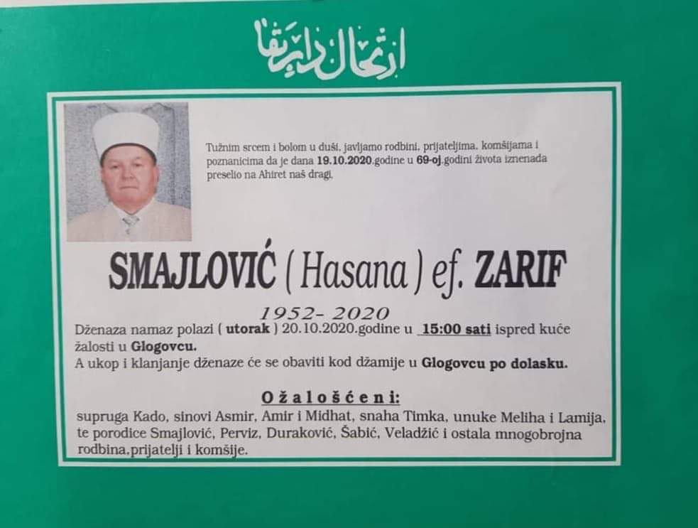 Tužnog srca i s bolom u duši obavještavamo rodbinu, komšije i prijatelje da je naš dragi Smajlović Hasana ef. Zarif 19. oktobra 2020. godine, u 69. godini života, preselio na Ahiret.