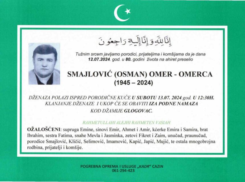 Tužnim srcem i bolom u duši javljamo rodbini, prijateljima i komšijama da je naš dragi Smajlović (Osman) Omer-Omerca, dana 12.07.2024. godine u 80-oj godini života, preselio na Ahiret.
