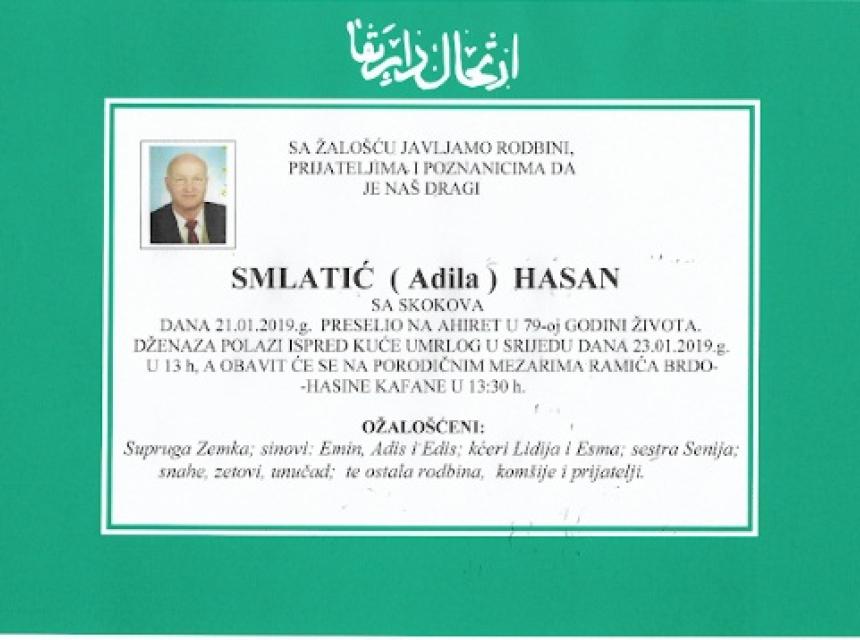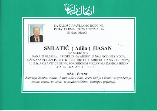 Sa žalošću javljamo rodbini, prijateljima i poznanicima da je naš dragi Smlatić (Adila) Hasan sa Skokova, dana 21.01.2019.godine preselio na Ahiret u 79-oj godini života. Dženaza polazi ispred kuće umrlog u srijedu dana 23.01.2019.godine u 13h, a obavit će se na porodičnim mezarima Ramića Brdo - Hasine kafane u 13:30h.
