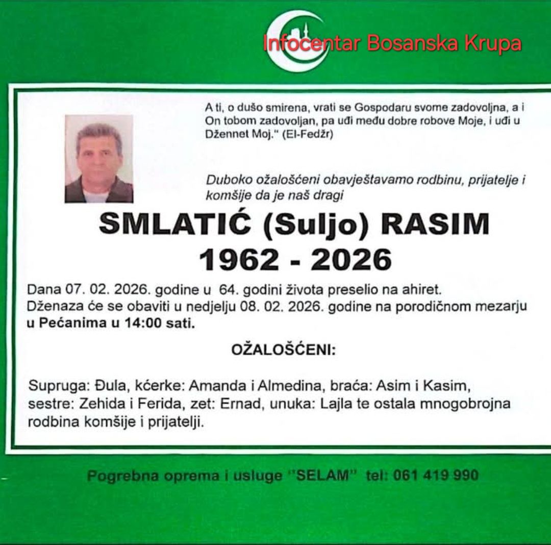 Duboko ožalošćeni obavještavamo rodbinu, prijatelje i komšije da je naš dragi SMLATIĆ (Suljo) RASIM 1962- 2026 dana 07. 02. 2026. godine u 64. godini života preselio na ahiret.