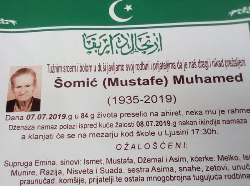 Tužnim srcem i bolom u duši, javljamo rodbini i prijateljima da je dana 07.07.2019 god. u 84. godini života preselio na Ahiret naš dragi Šomić (Mustafe) Muhamed.