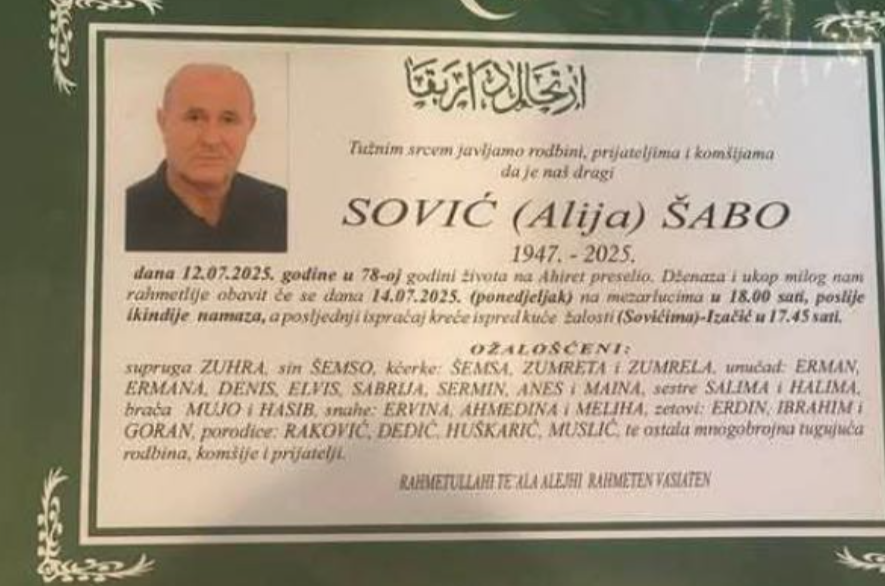 Dženaza polazi u ponedjeljak, 14. jula ispred kuće umrlog Sovići – Izačić u 17:45h a obavit će se na mezarju u 18 sati.