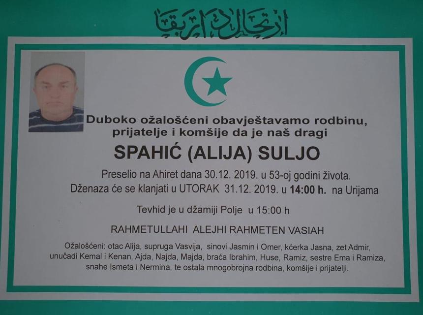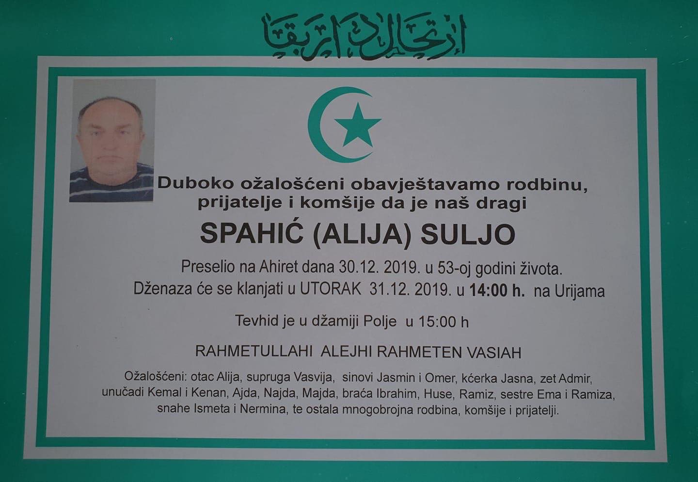 Duboko ožalošćeni obavještavamo rodbinu, prijatelje i komšije da je naš dragi Spahić (Alija) Suljo preselio na Ahiret dana 30.12.2019. godine u 53. godini života.
