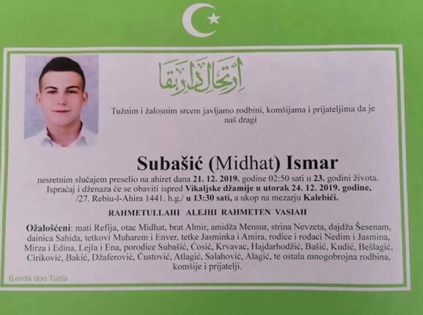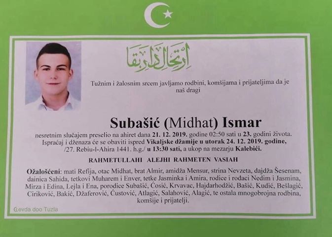 Tužnim srcem i s bolom u duši javljamo rodbini, prijateljima i komšijama da je 21.12.2019. godine u 02:50 h, u 23. godini života, nesretnim slučajem na Ahiret preselio Subašić (Midhat) Ismar.