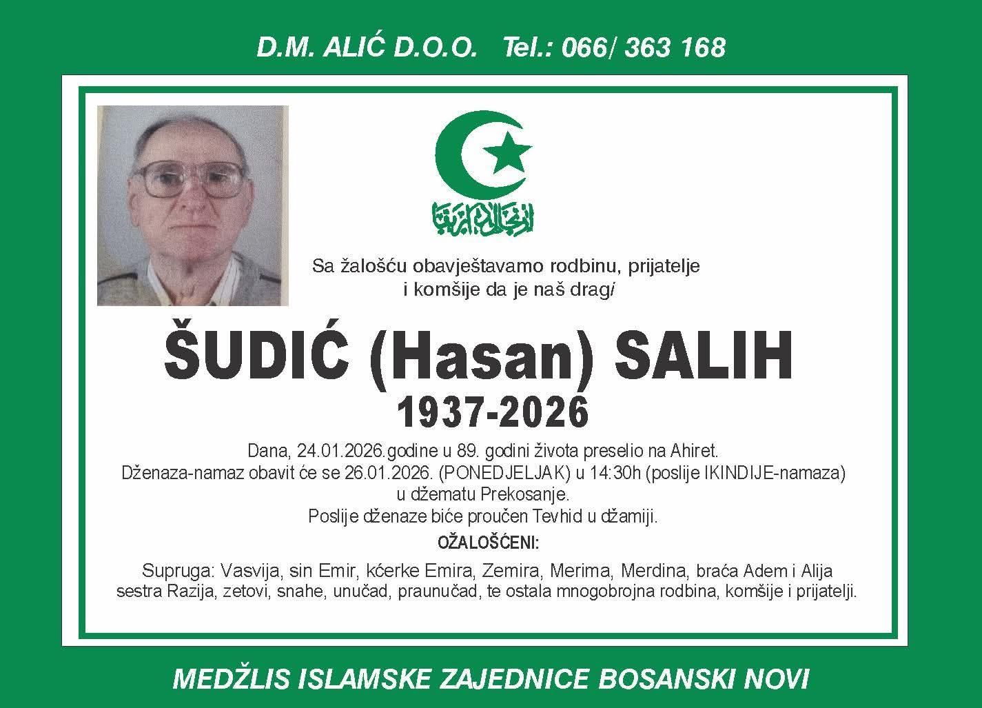 Sa žalošću obavještavamo rodbinu, prijatelje i komšije da je naš dragi ŠUDIĆ (Hasan) SALIH dana, 24.01.2026. godine u 89. godini života preselio na Ahiret.