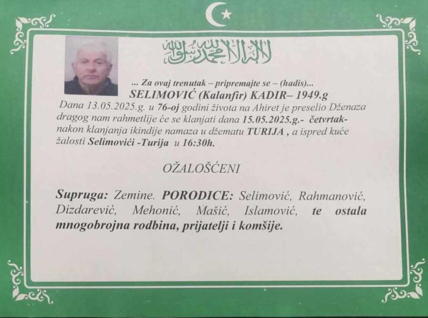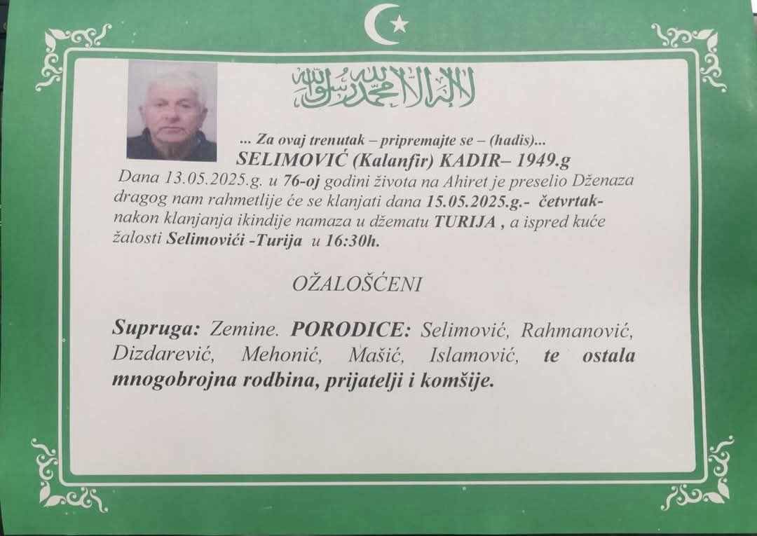 Dženaza dragog nam rahmetlije će se klanjati dana 15.05.2025. godine (ČETVRTAK) nakon klanjanja ikindije namaza u džematu TURIJA, a ispred kuće žalosti Selimovići - Turija u 16:30 sati.