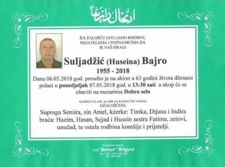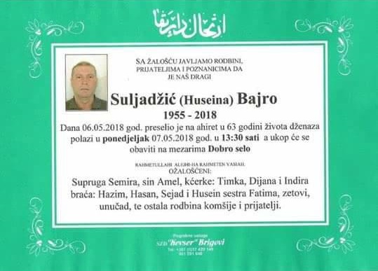 Tužnim srcem i bolom javljamo našim prijateljima da je demobilisani borac Bajro Suljadžić, dana 06.05.2018. godine u 63-oj godini života preselio na Ahiret.