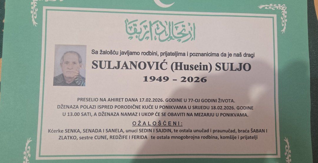 Dženaza polazi ispred porodične kuće u Ponikvama u srijedu 18.02.2026. godine u 13.00 sati, a dženaza namaz i ukop će se obaviti na mezarju u Ponikvama.
