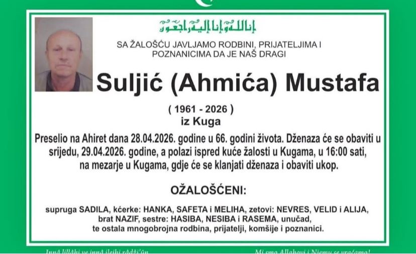 Dženaza će se obaviti u srijedu, 29.04.2026. godine, a polazi ispred kuće žalosti u Kugama, u 16:00 sati, na mezarje u Kugama, gdje će se klanjati dženaza i obaviti ukop.