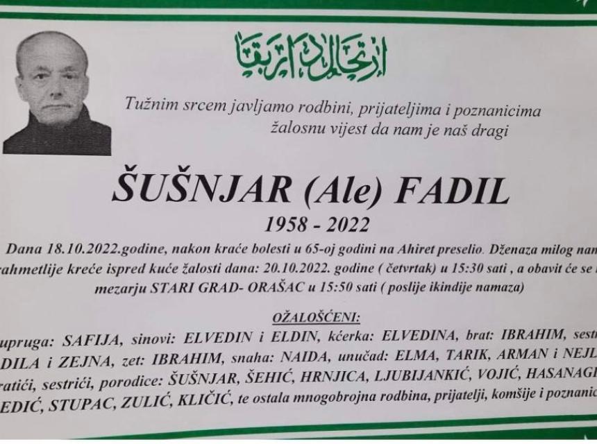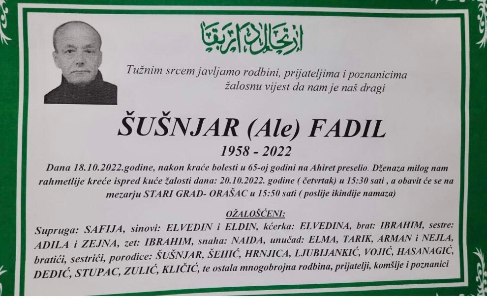 Tužnog srca i s bolom u duši obavještavamo rodbinu, komšije i prijatelje da je naš dragi Šušnjar (Ale) Fadil preselio na Ahiret.