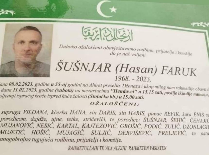 Tužnim srcem i bolom u duši javljamo rodbini, prijateljima i komšijama da je naš dragi Šušnjar (Hasan) Faruk preselio na Ahiret dana 08.02.2023.godine u 55-oj godini života.