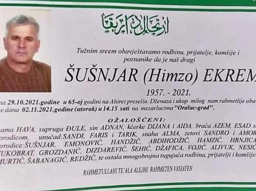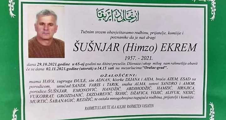 Tužnim srce objavještavamo rodbinu, prijatelje, komšije i poznanike da je naš dragi Šušnjar (Himzo) Ekrem dana 29.10.2021 u 65. godini života na Ahiret preselio.