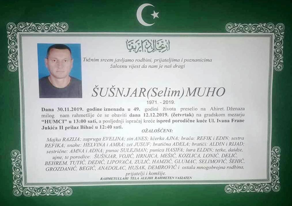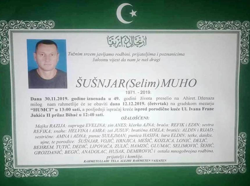 Tužnim srcem i bolom u duši javljamo rodbini, prijateljima, komšijama i poznanicima da je dana 30.11.2019. god. u 49.oj godini života preselio na Ahiret naš dragi Šušnjar (Selim) Muho.