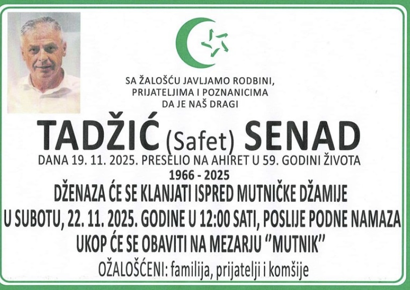 Dženaza će se klanjati ispred Mutnićke džamije u subotu, 22. 11. 2025. godine u 12:00 sati, poslije podne-namaza.