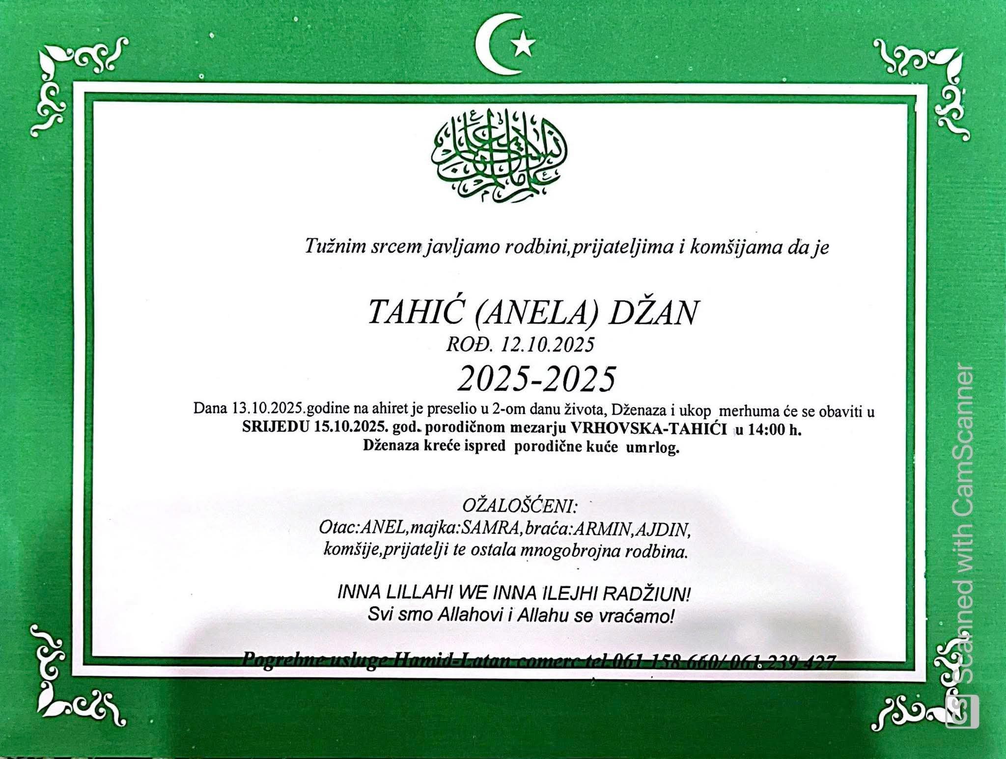 Dana 13.10.2025. godine na ahiret je preselio u 2-om danu života. Dženaza i ukop merhuma će se obaviti u SRIJEDU 15.10.2025. god. porodičnom mezarju VRHOVSKA–TAHIĆI u 14:00 h.