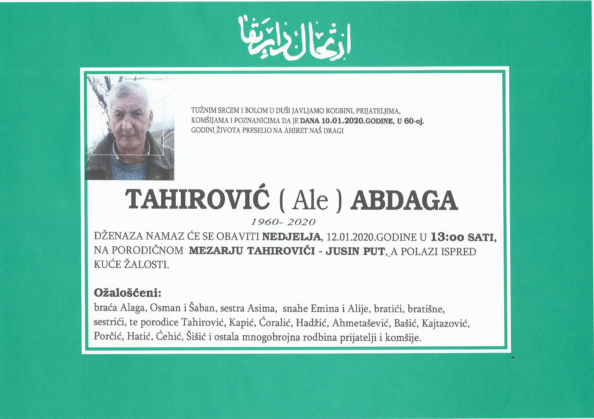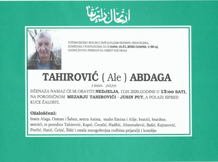 Tužnim srcem i bolom u duši javljamo rodbini, prijateljima, komšijama i poznanicima da je dana 10.01.2020. godine, u 60-oj. godini života preselio na Ahiret naš dragi Tahirović (Ale) Abdaga.