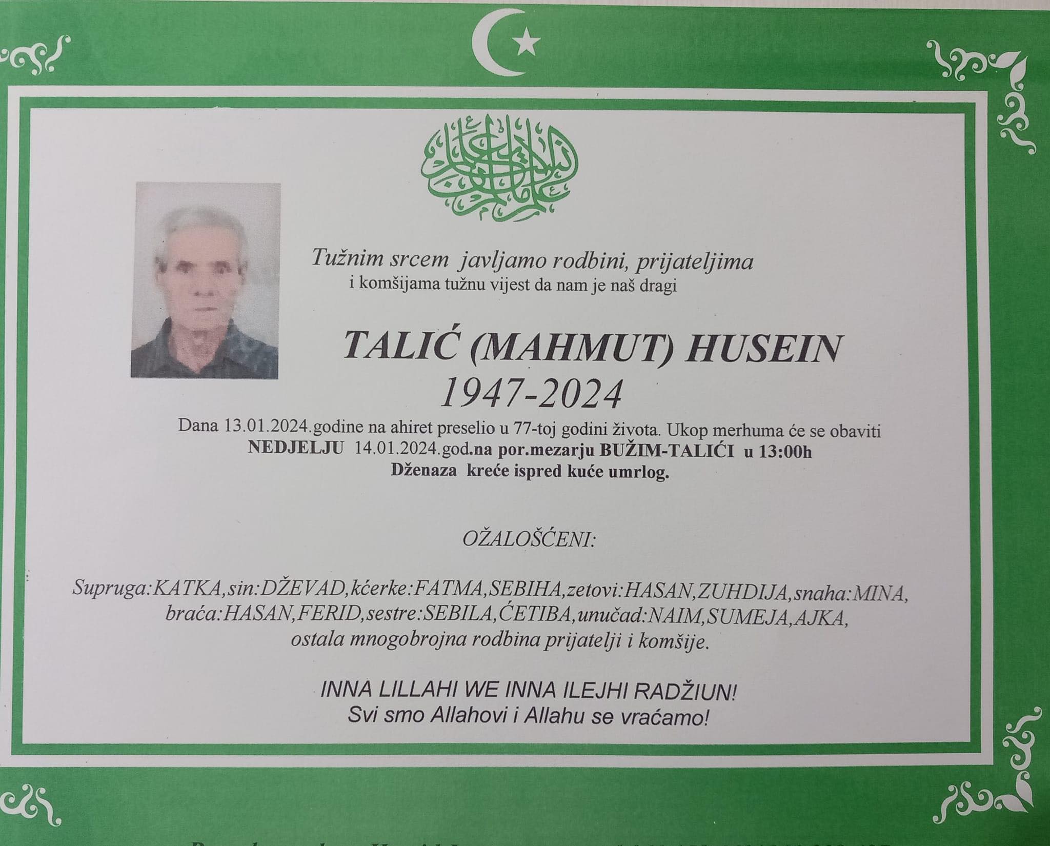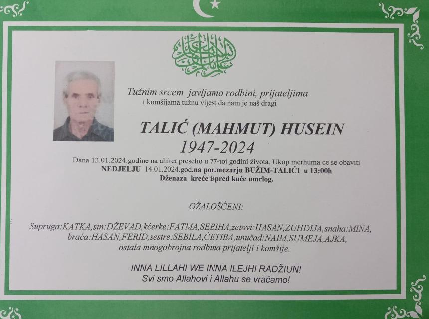 Tužnim srcem javljamo porodici, prijateljima i komšijama da je dana 13.01.2024. god. u 77. godini života na Ahiret preselio Talić (Mahmut) Husein.