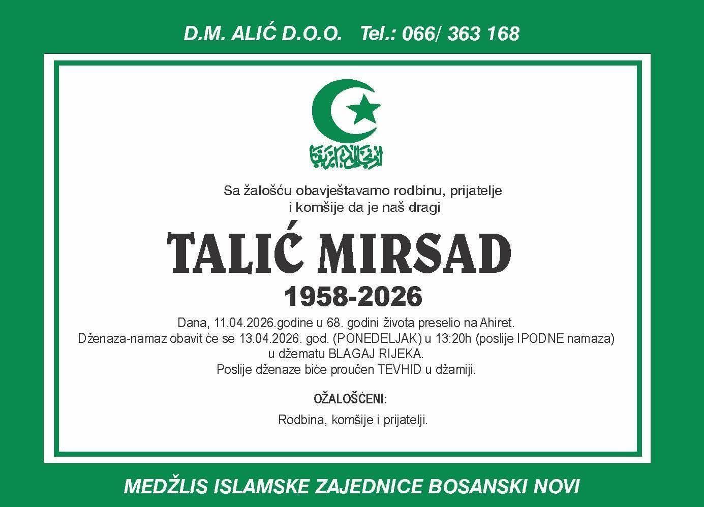 Dženaza-namaz obavit će se 13.04.2026. god. (PONEDELJAK) u 13:20h (poslije IPODNE namaza) u džematu BLAGAJ RIJEKA.