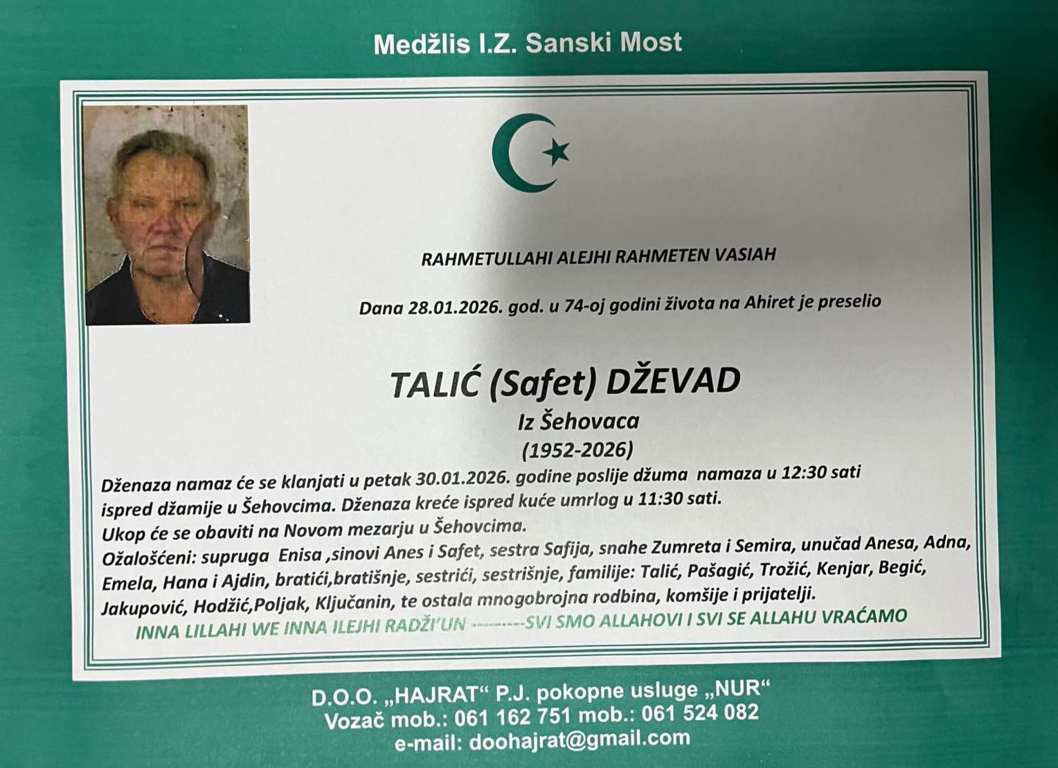Dženaza namaz će se klanjati u petak 30.01.2026. godine poslije džuma namaza u 12:30 sati ispred džamije u Šehovcima. Dženaza kreće ispred kuće umrlog u 11:30 sati.
