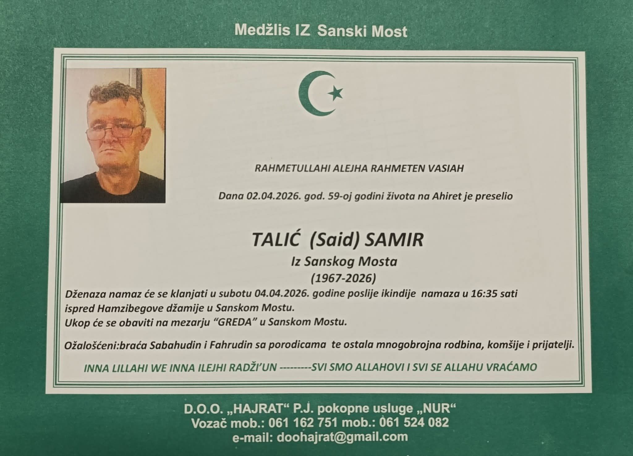 Dženaza namaz će se klanjati u subotu 04.04.2026. godine poslije ikindije namaza u 16:35 sati ispred Hamzibegove džamije u Sanskom Mostu.