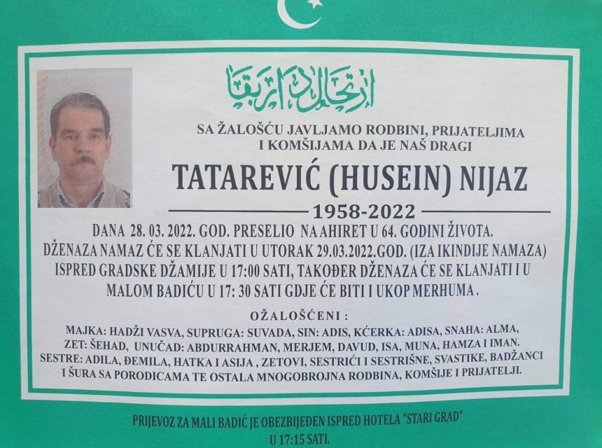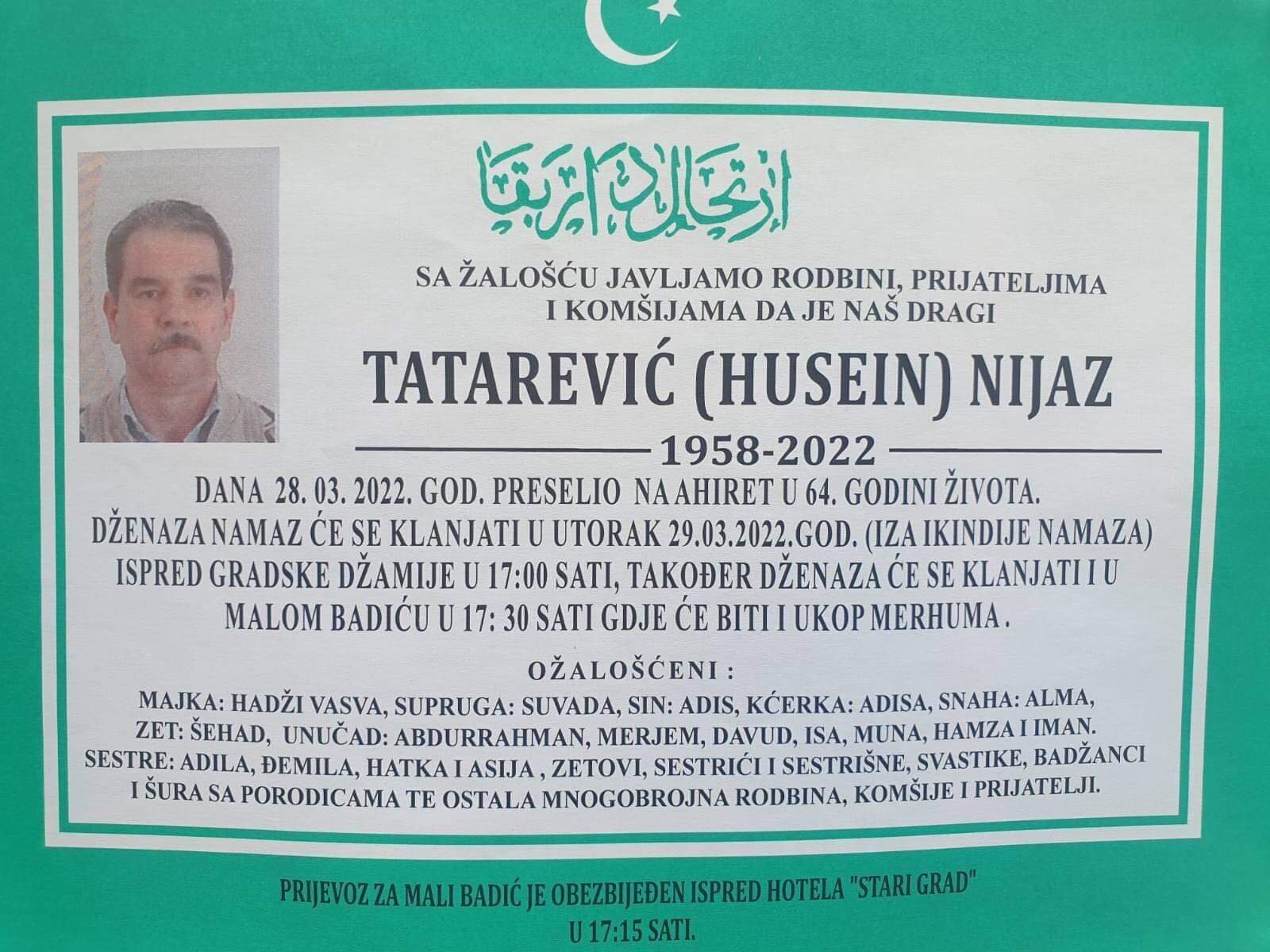 Tužnog srca i s bolom u duši obavještavamo rodbinu, komšije i prijatelje da je naš dragi Tatarević (Husein) Nijaz u 64. godini života preselio na Ahiret.