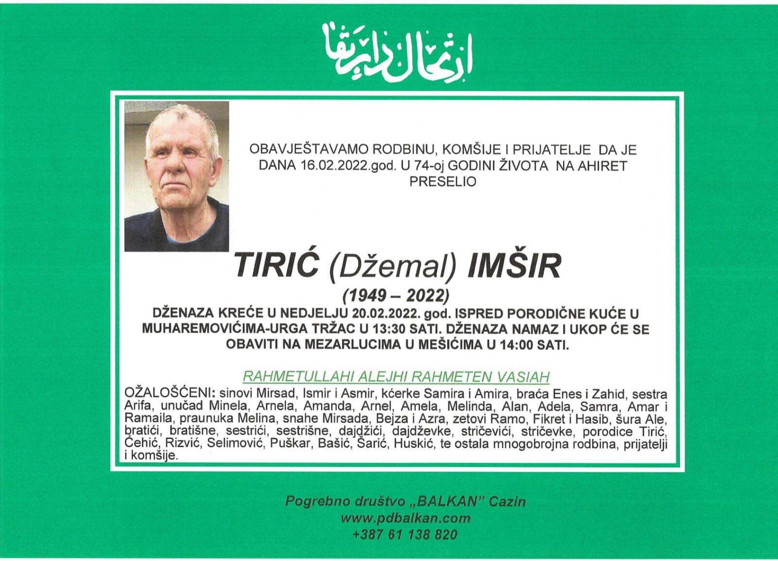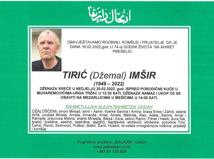 Tužnog srca i s bolom u duši obavještavamo rodbinu, komšije i prijatelje da je naš dragi Tirić (Džemal) Imšir 16.02.2022. u 74. godini života preselio na ahiret.