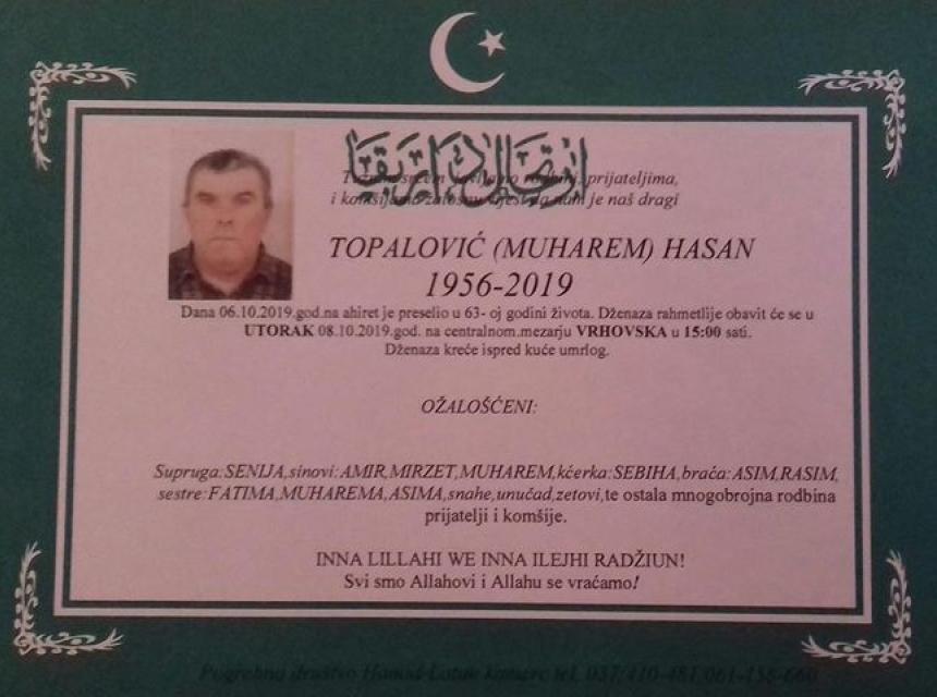 Duboko ožalošćeni obaviještavamo prijatelje i komšije da je naš dragi Topalović (Muharem) Hasan preselio na Ahiret 06.10.2019. godine, u 63. godini života.