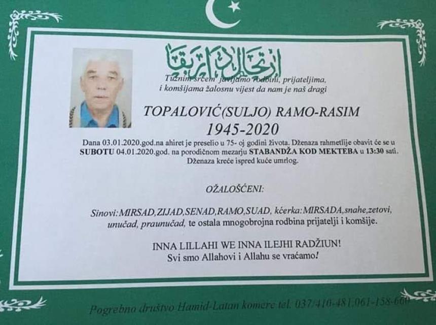 Duboko ožalošćeni obavještavamo rodbinu, prijatelje i komšije da je naš dragi Topalović (Suljo) Ramo-Rasim preselio na Ahiret dana 03.01.2020. godine u 75. godini života.
