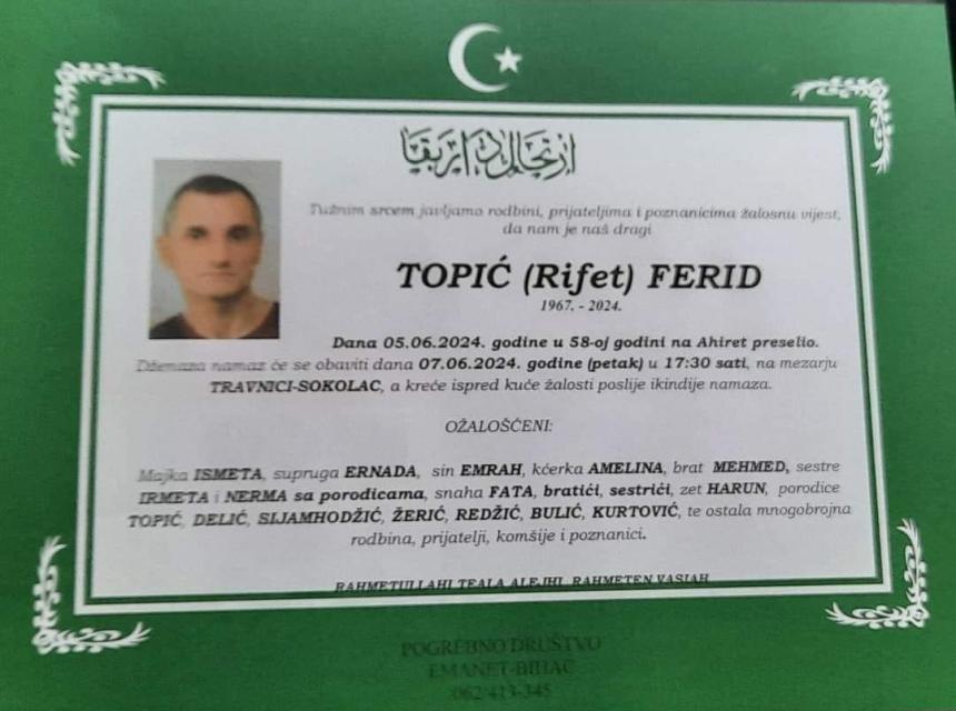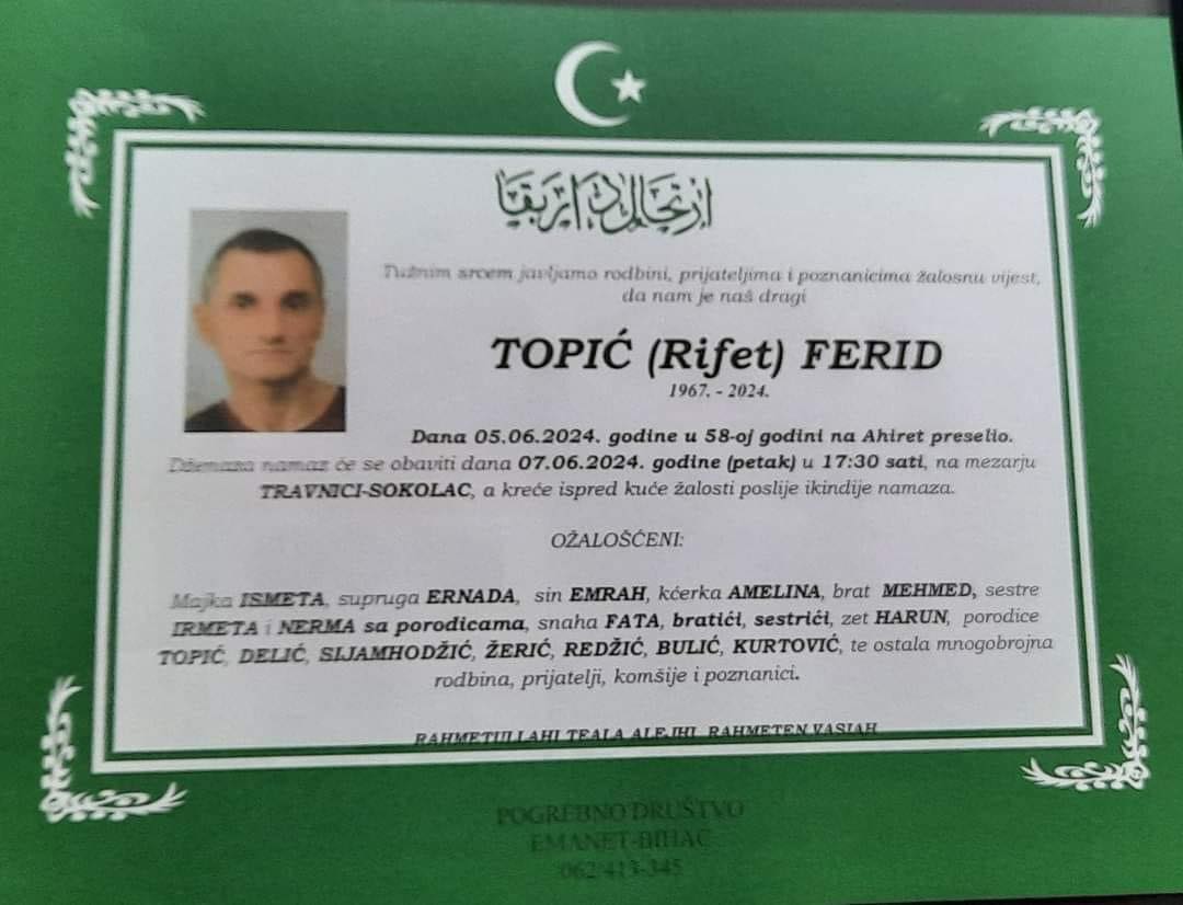 Tužnim srcem i bolom u duši obavještavamo rodbinu, prijatelje i komšije da je naš dragi Topić (Rifet) Ferid, dana 05.06.2024. godine u 58-oj godini života, preselio na Ahiret.