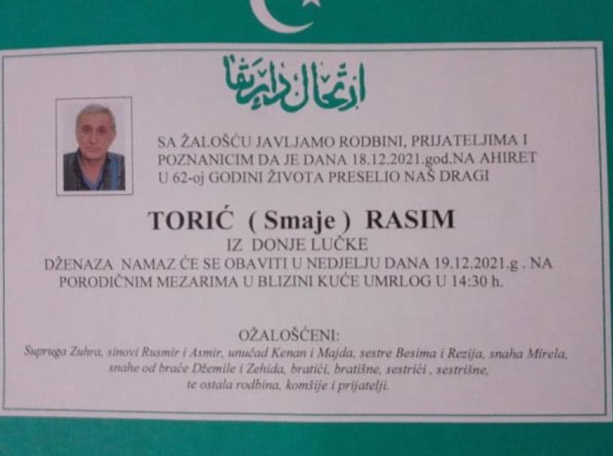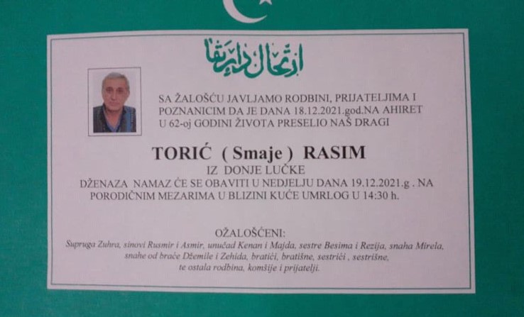 Tužnog srca i s bolom u duši obavještavamo rodbinu, komšije i prijatelje da je naš dragi Torić (Smaje) Rasim dana 18.12.2021. u 62. godini života preselio na ahiret.
