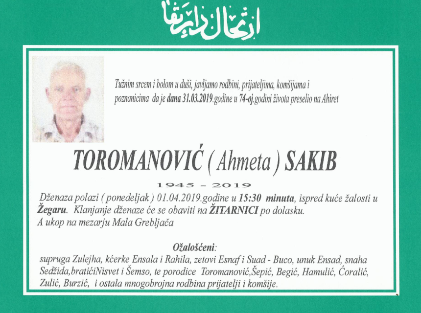 Tužnim srcem i bolom u duši, javljamo rodbini, prijateljima, komšijama i poznanicima da je dana 31.03.2019. godine u 74-oj. godini života preselio na Ahiret Toromanović (Ahmeta) Sakib.