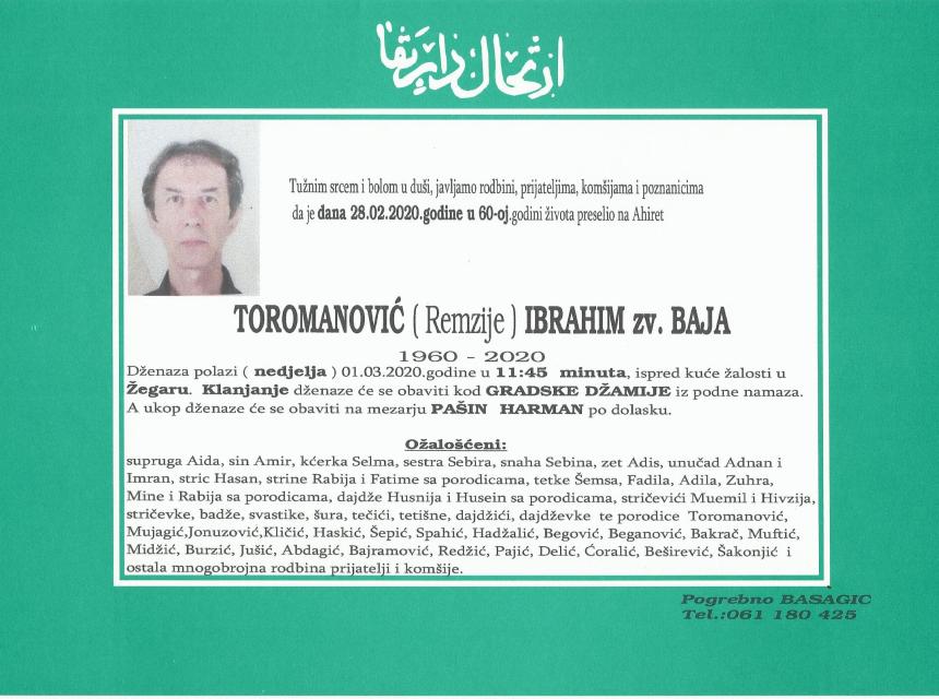 Duboko ožalošćeni obaviještavamo rodbinu, prijatelje i komšije da je naš dragi Toromanović (Remzije) Ibrahim zv. Baja 28.02.2020. u 60. godini života preselio na Ahiret.
