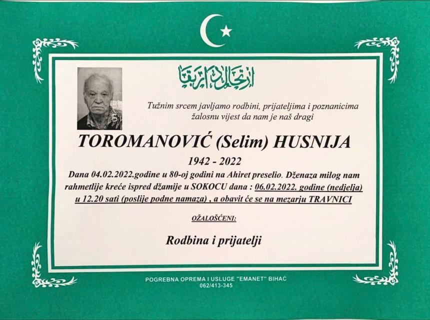 Tužnog srca i s bolom u duši obavještavamo rodbinu, komšije i prijatelje da je naš dragi Toromanović (Selim) Husnija, dana 04.02.2022. godine, u 80-oj godini života, preselio na Ahiret.