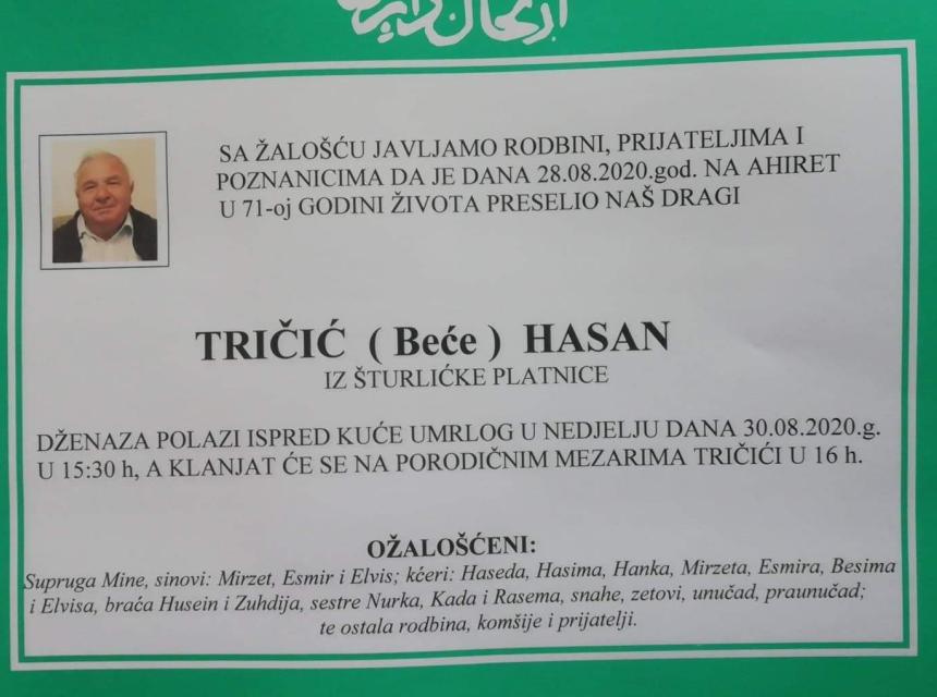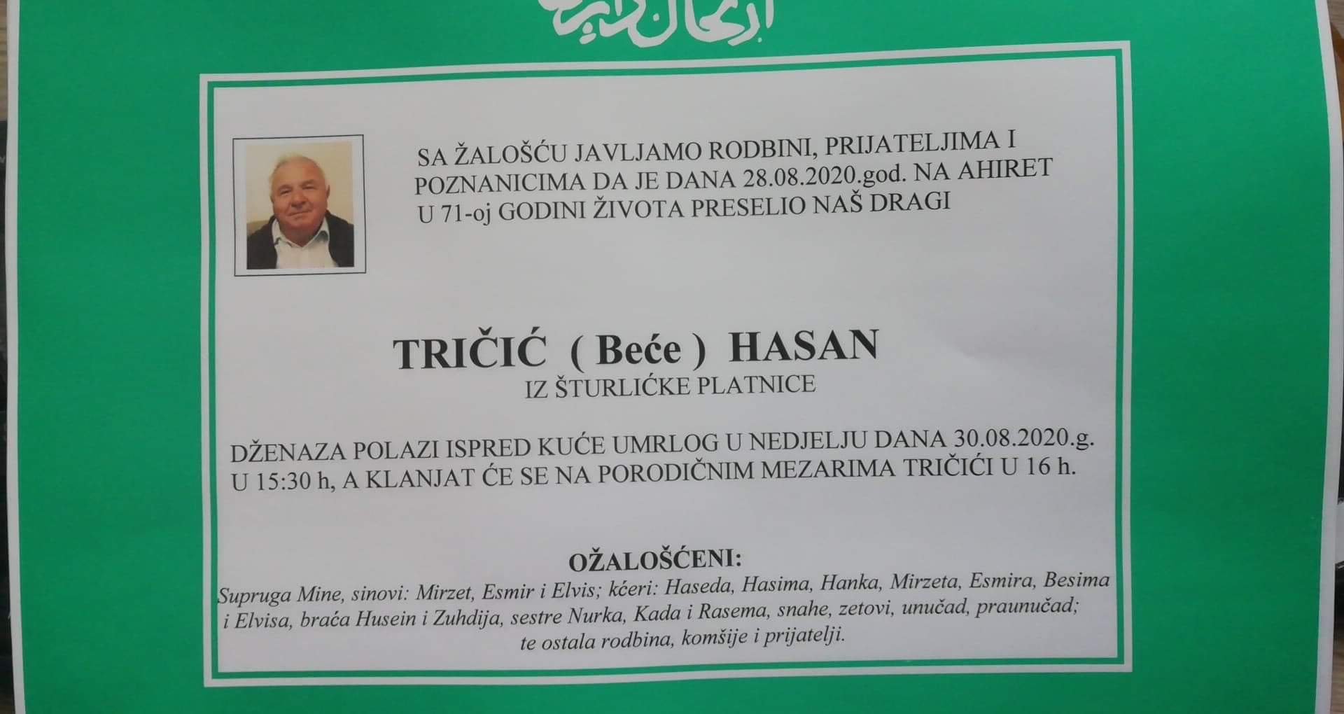 Tužnog srca i s bolom u duši obavještavamo rodbinu, komšije i prijatelje da je naš dragiTričić (Beće) Hasan , dana 28.08.2020. godine, u 71-oj. godini života, preselio na Ahiret.