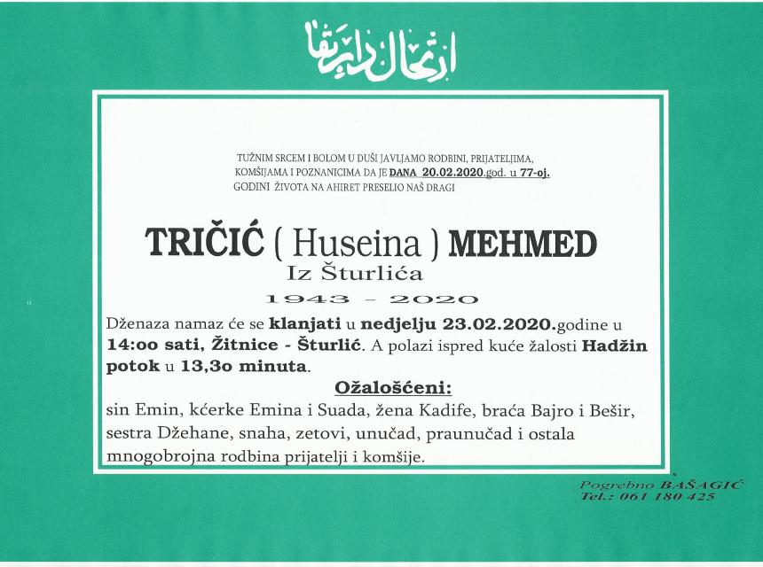 Tužnog srca i s bolom u duši obavještavamo rodbinu, komšije i prijatelje da je u četvrtak 20.02.2020. godine naš dragi Tričić (Huseina) Mehmed u 77-oj godini preselio na Ahiret.