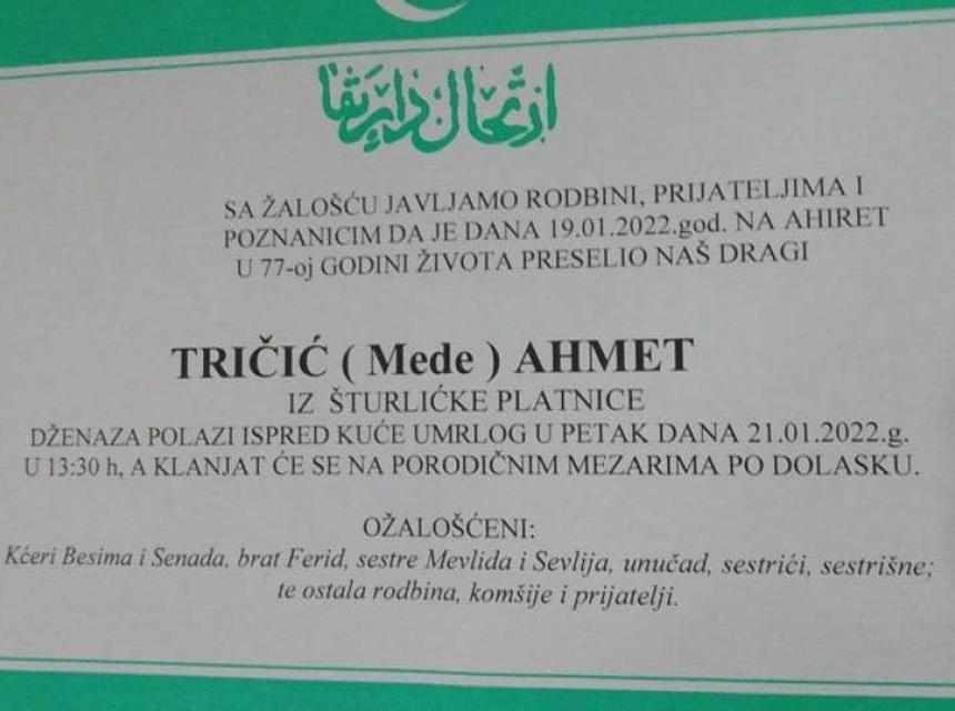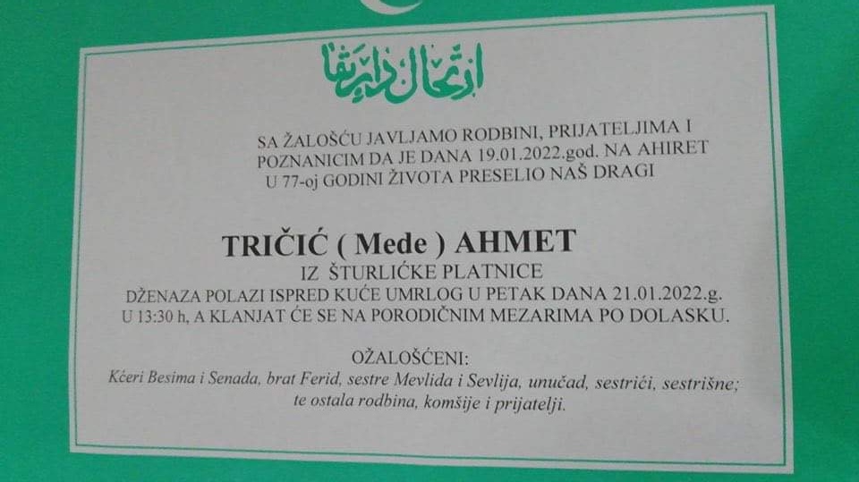 Tužnog srca i s bolom u duši obavještavamo rodbinu, komšije i prijatelje da je naš dragi Tričić (Mede) Ahmet 19.1.2022. u 77. godini života preselio na ahiret.