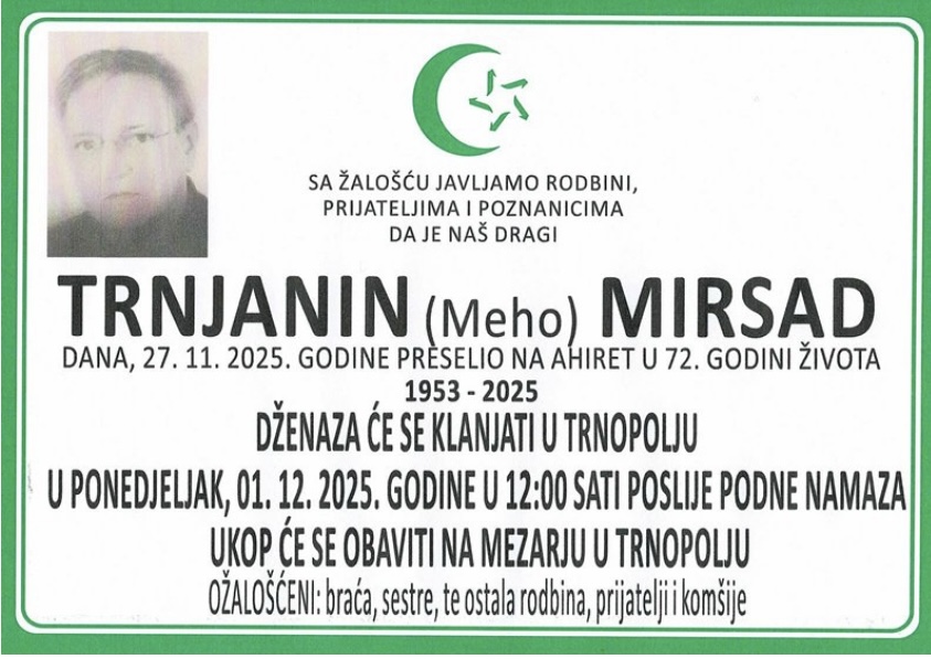 Dženaza će se klanjati u Trnopolju u ponedjeljak, 01.12.2025. godine u 12:00 sati poslije podne-namaza.