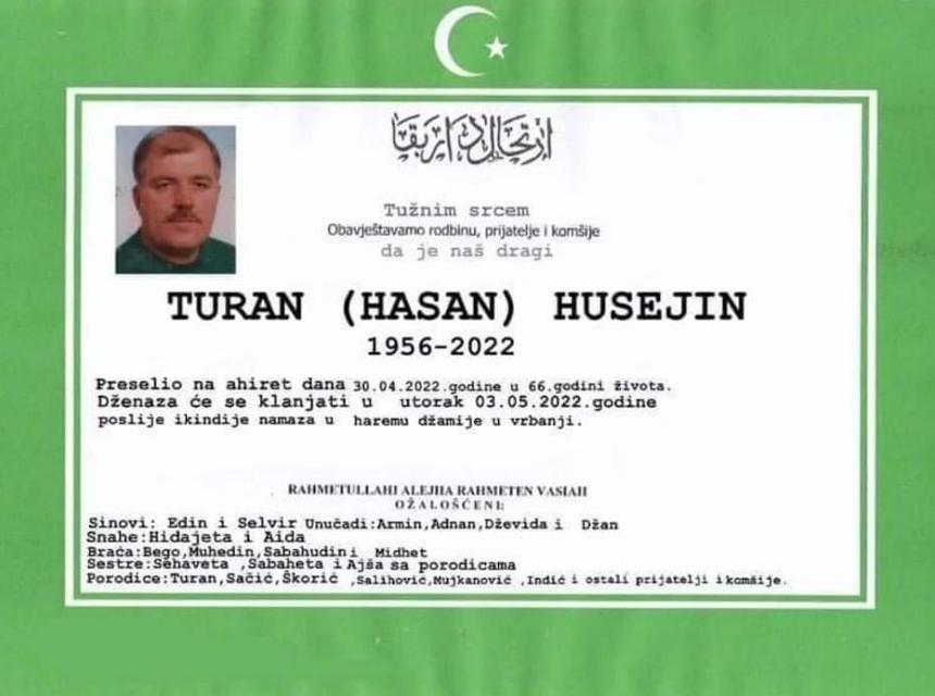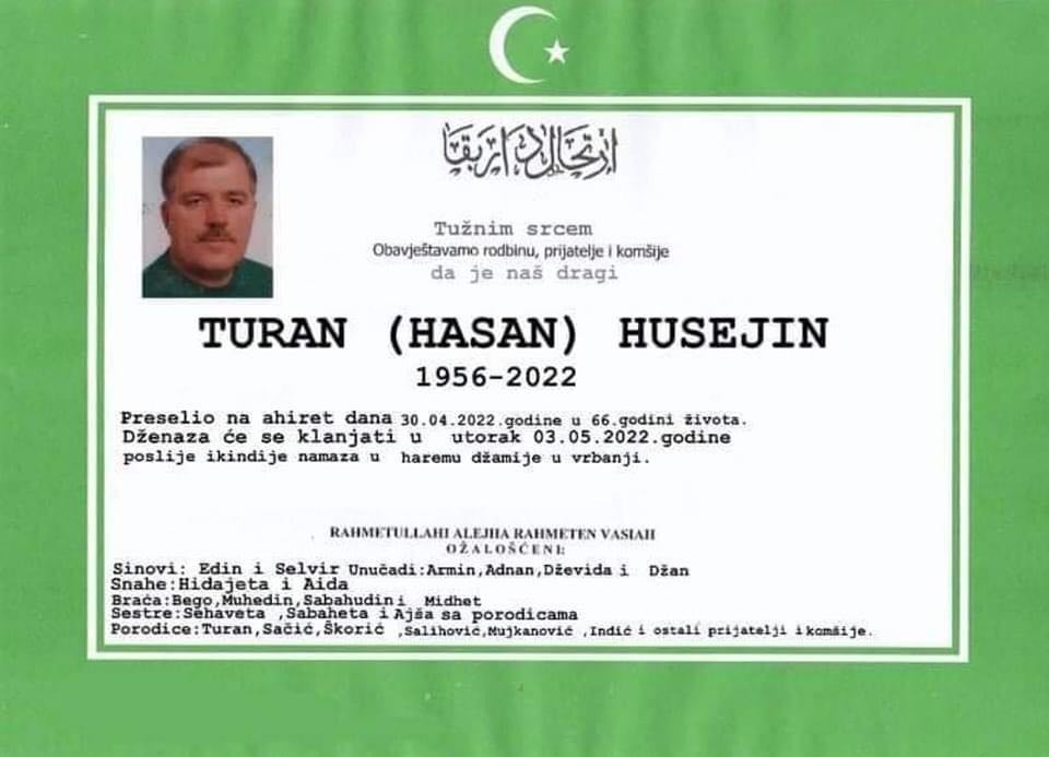 Tužnog srca i s bolom u duši obavještavamo rodbinu, komšije i prijatelje da je naš dragi Turan (Hasan) Husejin, dana 30.04.2022. godine, u 66-oj godini života, preselio na Ahiret.