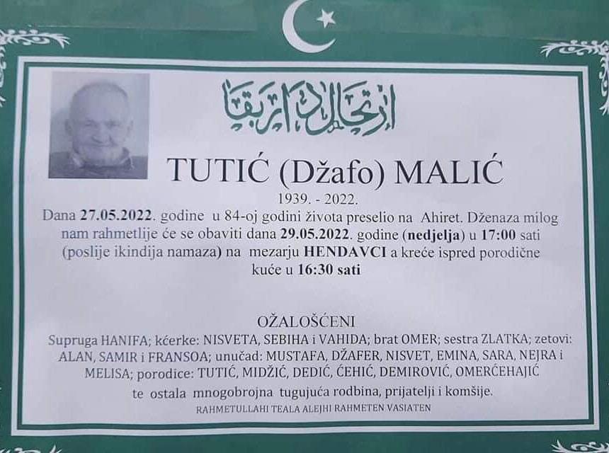 Tužnog srca i s bolom u duši obavještavamo rodbinu, komšije i prijatelje da je naš dragi Tutić (Džafo) Malić u 84. godini života preselio na Ahiret.