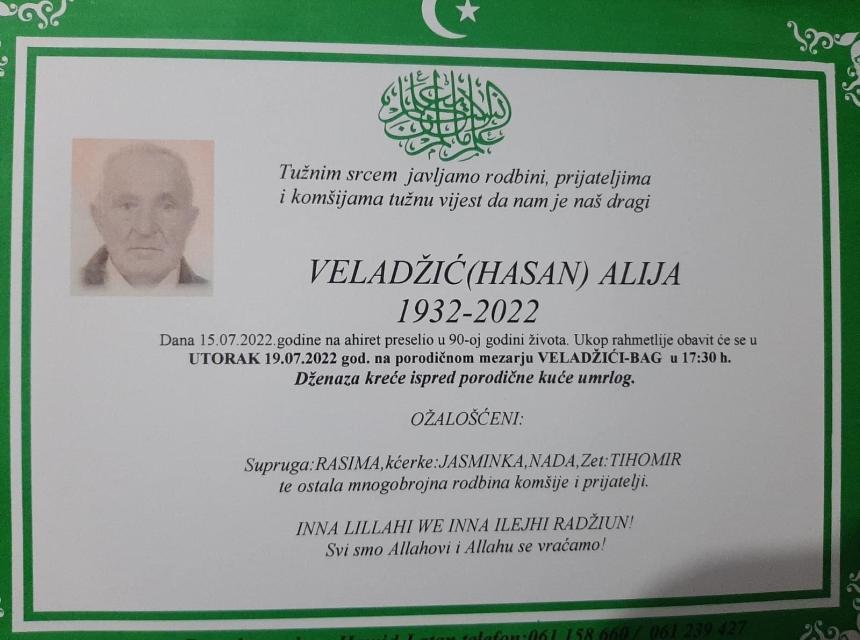 Tužnog srca i s bolom u duši obavještavamo rodbinu, komšije i prijatelje da je naš dragi Veladžić (Hasan) Alija u 90. godini preselio na Ahiret.