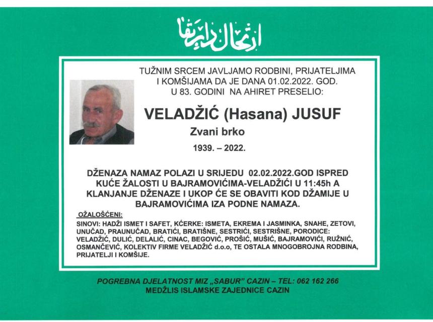 Tužnog srca i s bolom u duši obavještavamo rodbinu, komšije i prijatelje da je naš dragi Veladžić (Hasana) Jusuf 1.02.2022. u 83. godini života preselio na ahiret.